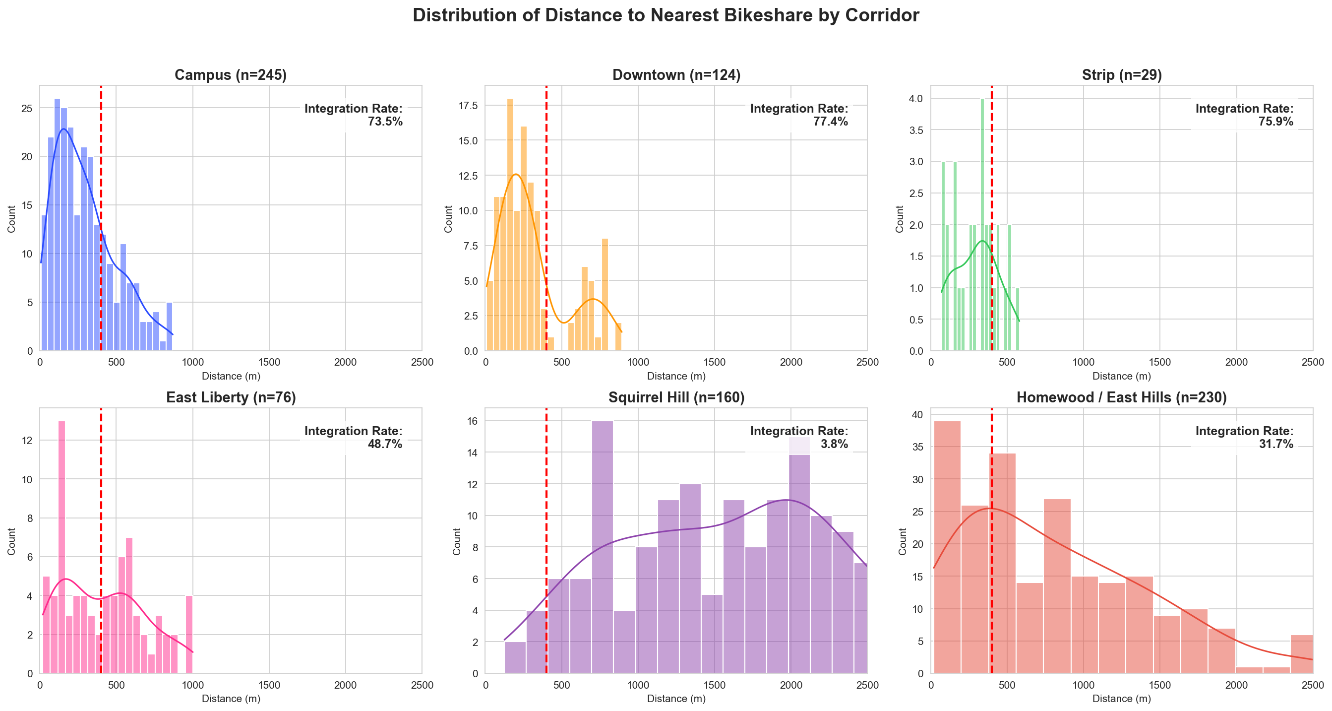 - Squirrel Hill: CRITICAL GAP. High bus ridership but >1km median distance to bike stations.